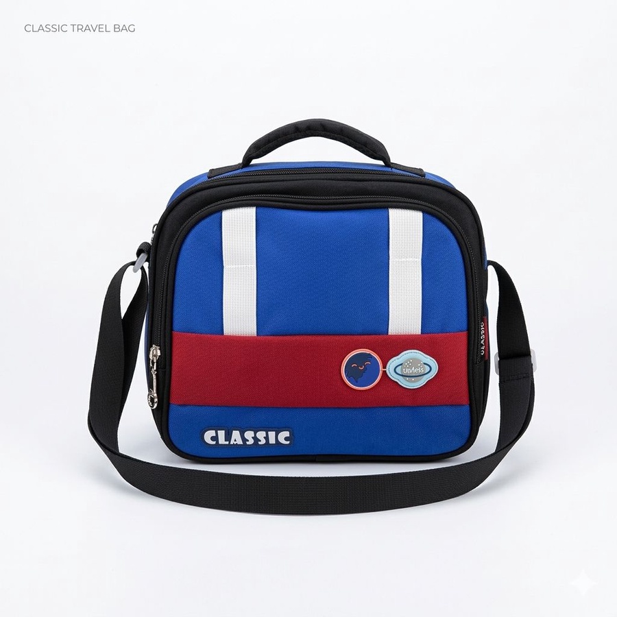 التصميم: لون أزرق مع إطار وتفاصيل أخضر ساحلي، شريط بيج عريض في المنتصف عليه باتشات دائرية واسم CLASSIC في الركن، مع يد علوية مبطنة وسحاب علوي مزدوج لسهولة الفتح.