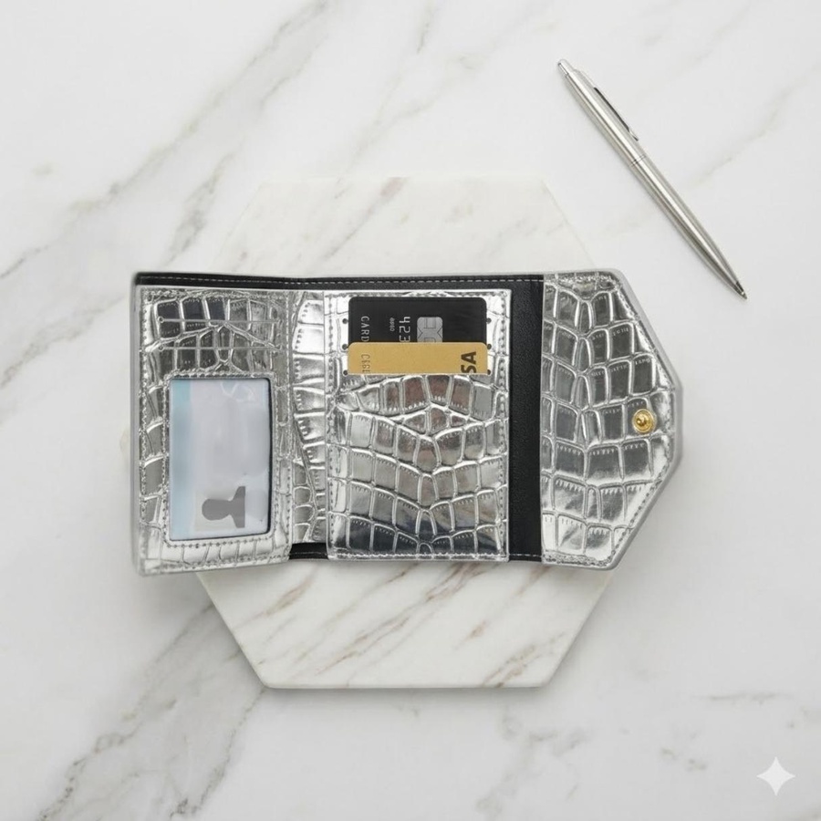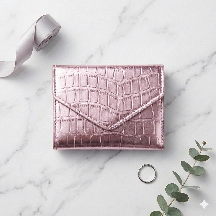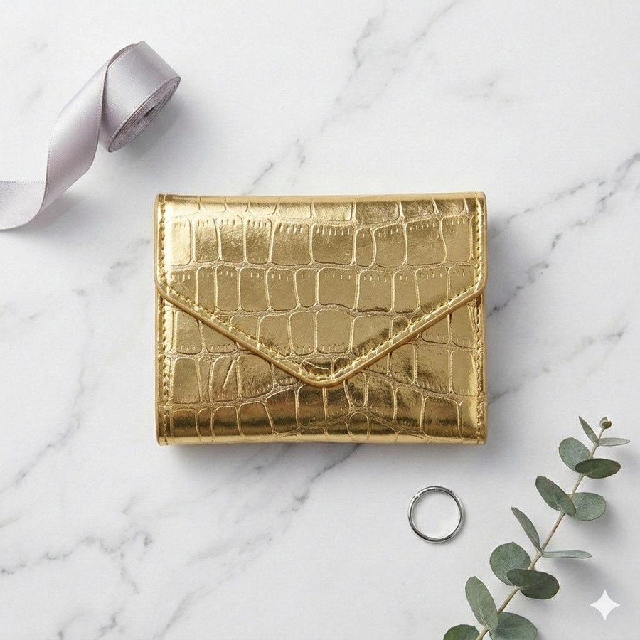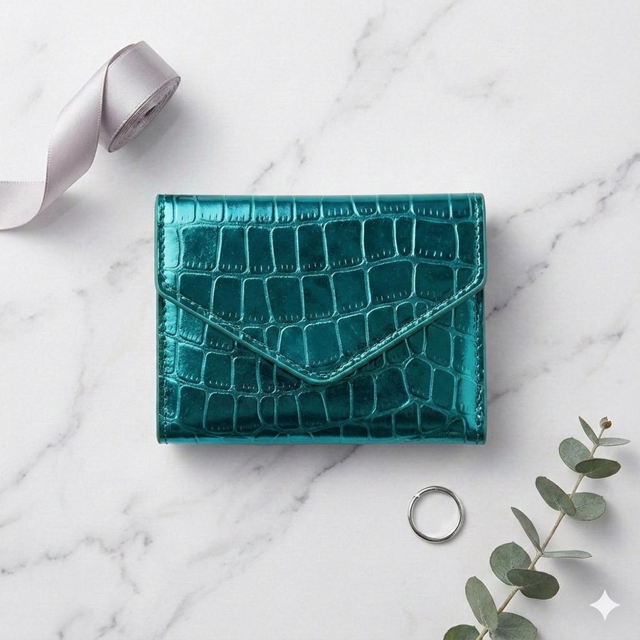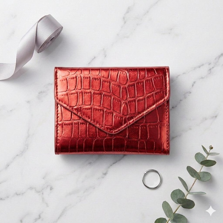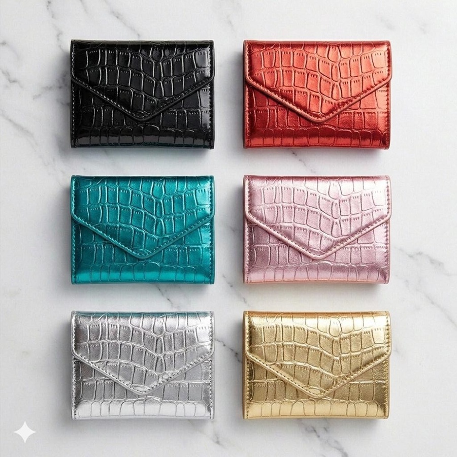 محفظة حريمي صغيرة ستايل ظرف، جلد لامع بنقشة مُجَعَّدة شيك، متاحة بألوان جريئة زي الأحمر، الفيروزي، الذهبي، الأسود والموف علشان تختاري على مزاجك.
